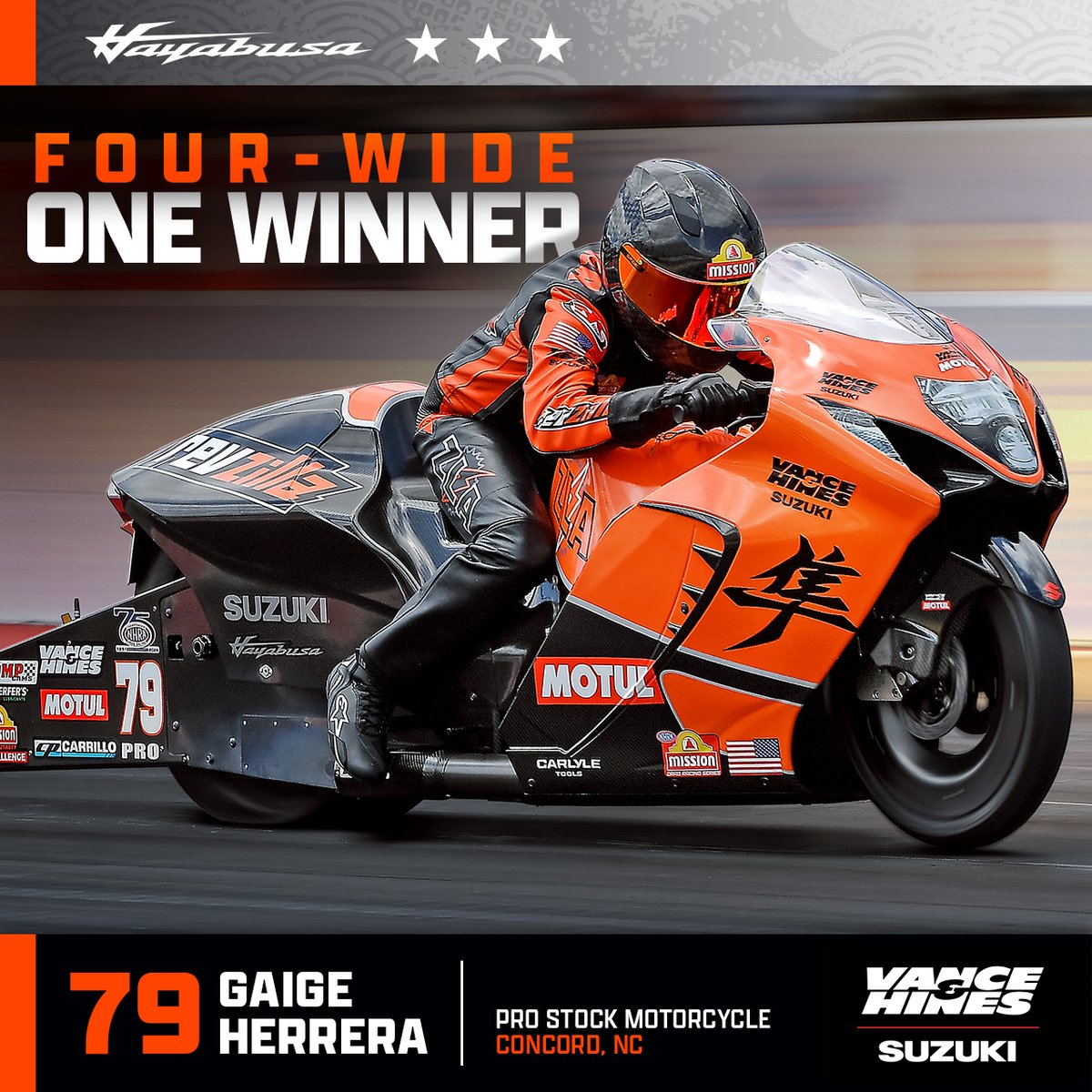 FOUR-WIDE. ONE WINNER. Gaige Herrera goes for gold yet again. The two-time NHRA Pro Stock Motorcycle world champ was on it at the 4-Wide Nationals. #Suzuki #SuzukiCycles #Hayabusa