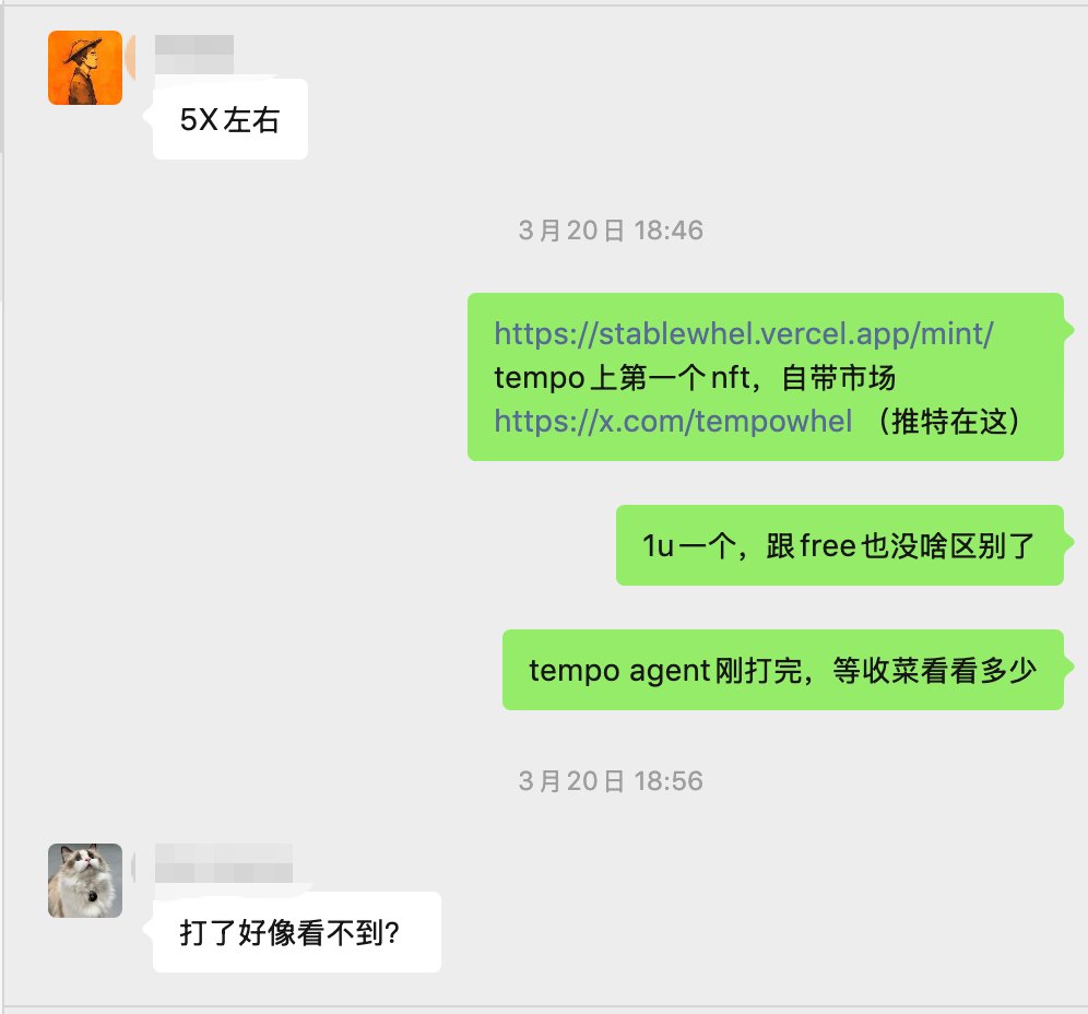 #Tempo 链上的打新还是蛮有趣的 凌晨一点多 @TempoFuds 开打 @tempowhel 持有者自动保证白 一个0.4U 一个白可以Mint 10个 0.4U~2.45U 6.1X 第二个 @Slayffin2 Stable Whel持有者 free mint 3个 说是进行压力测试的NFT 公开秒没 0~最高9U 9x 今天比较期待的是 @TotemWild 同样是 free mint