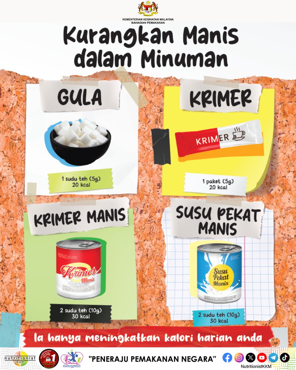 Minum manis-manis tu best tapi hanya tingkatkan jumlah kalori yang tak perlu! Jom kurangkan gula, krimer, dan susu pekat manis dalam minuman kita. Badan sihat, hati pun senang! #KurangkanGula #MinumSihat #TipsSihat #InfoPemakananSihat #NutritionistKKM