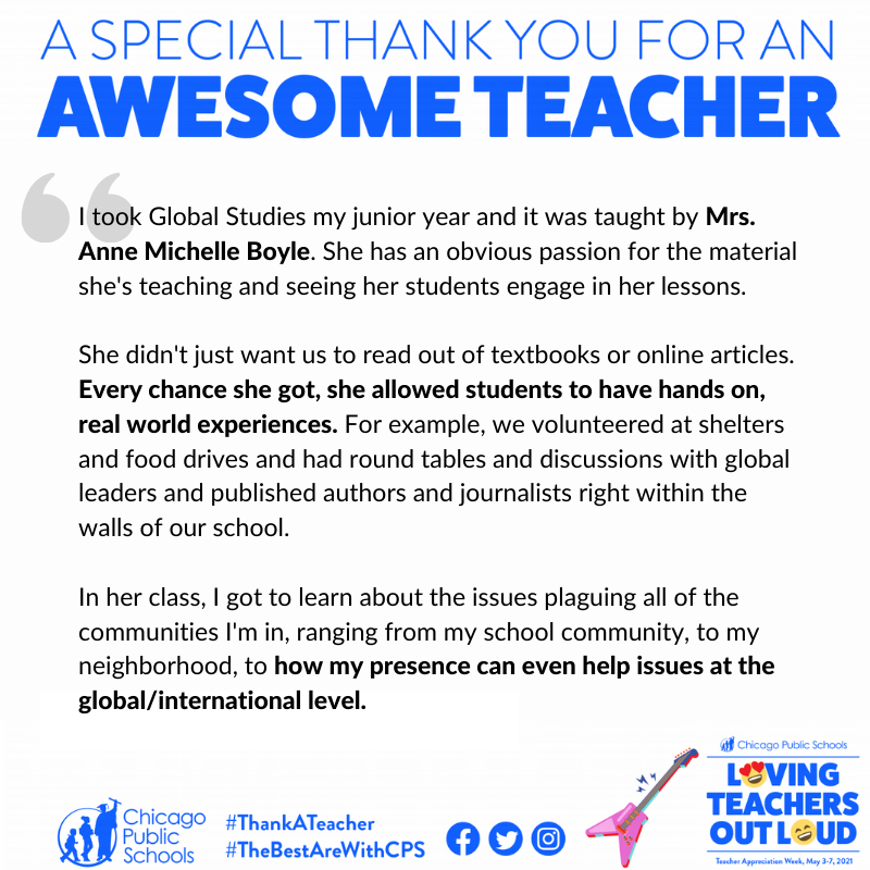 Shout out to @ChiPubSchools #TransformativeTeacher, Mrs. Anne Michelle Boyle, who teaches Global Studies at @wyhs! A former student shares that every chance she got, she allowed students to have hands on, real world experiences. #TheBestAreWithCPS #ThankATeacher #EngageCPS