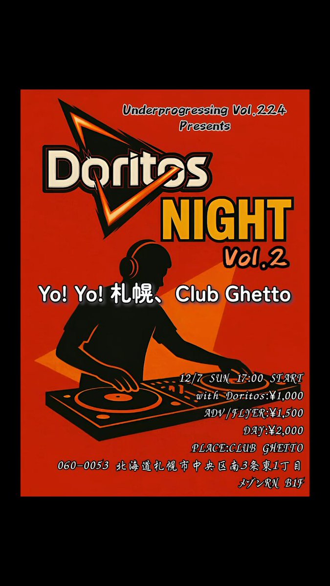 🔥 Doritos Night Vol.2, UnderProgressing vol.224 at CLUB GHETTO 12/7 SUN 17:00 START Doritos持参¥1,000 — Crunch & Dance 🍟🔥 2025年最後の激アツ夜。来い。 #DoritosNight #UnderProgressing #ClubGhetto #札幌 #Sapporo #HipHop #クラブイベント #DJ #ヒップホップ #サイファー