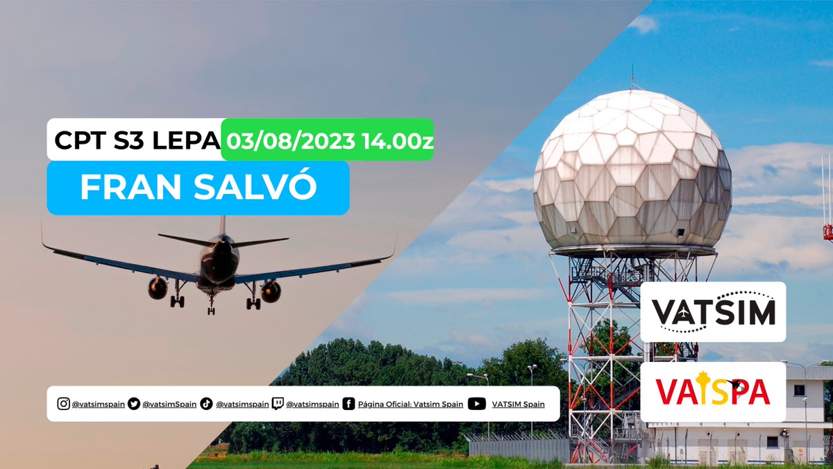 Este jueves día 3, a las 1400Z, en Palma Control (LEPA), nuestro compañero Fran Salvó se examinará para tratar de obtener su rango S3 en LEPA_APP. ¡Todo tipo de llegadas y salidas son bienvenidas! ✈️ ¡Muchísima suerte Maximilian! ✈️ #vatsim #vatsimexam #vatsimnetwork