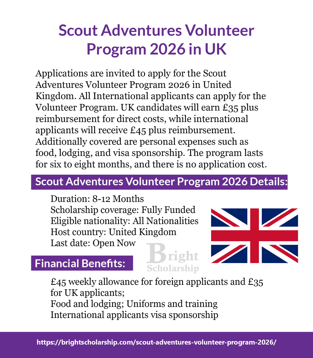 Scout Adventures Volunteer Program 2026 in UK (Fully Funded) Duration: 8-12 Months Eligible nationality: All Nationalities Host country: United Kingdom Last date: Open Now Apply Link: brightscholarship.com/scout-adventur… #BrightScholarship #FullyFunded #VolunteerProgram #UK