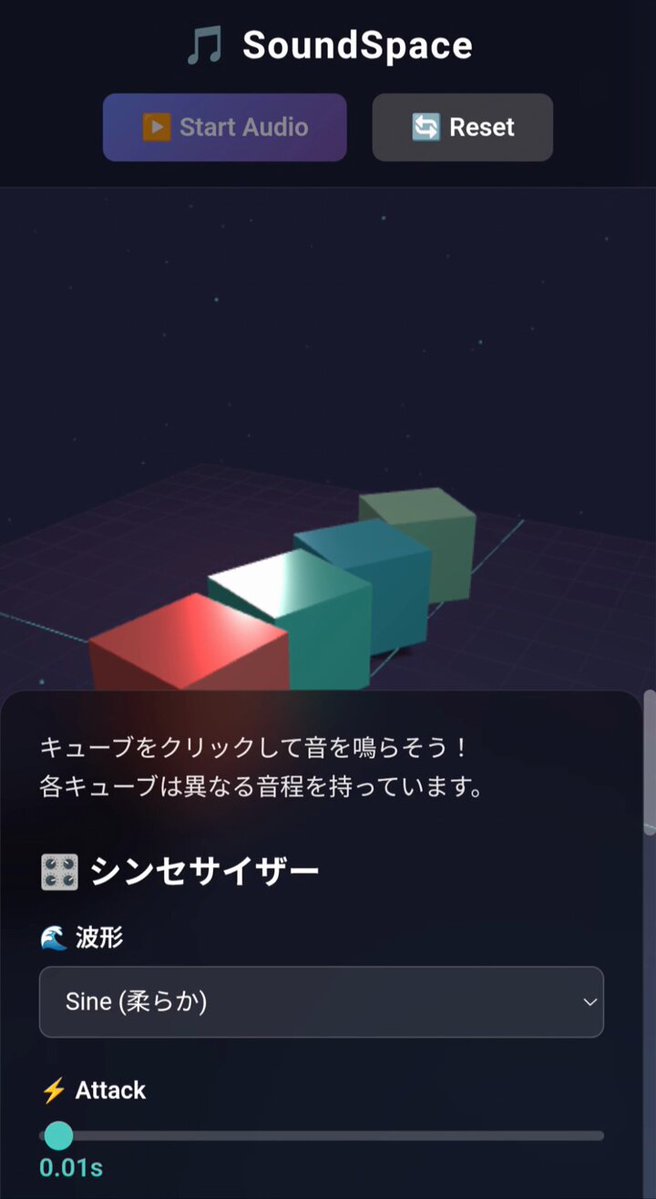 【Claude Codeで試作】ブラウザで3D音遊び 🔷キューブをクリックすると視覚的に音遊びできるよ♪ moshimur.github.io/SoundSpace-v2/ 🔹工夫したところ🔹 3D空間の構築(Three.js) 基本的な音の再生(Web Audio API) クリックアニメ(音&ジャンプ & 発光) #threejs #WebAudioAPI