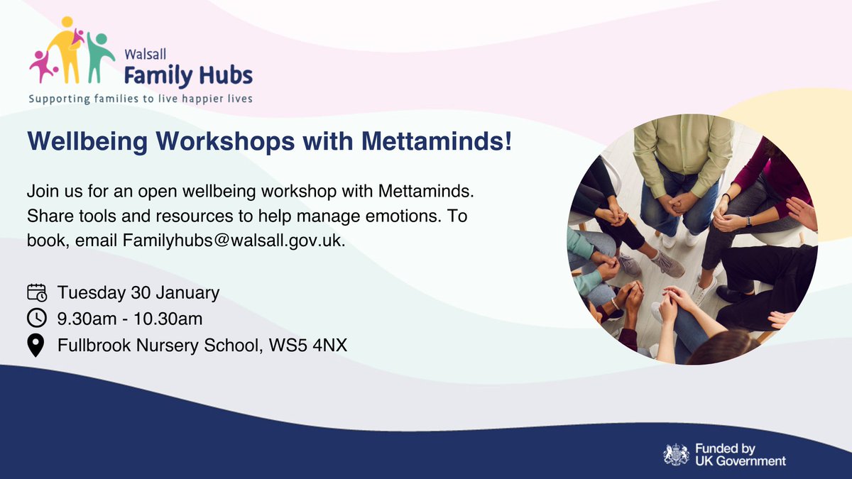 📢 Empower yourself and your child! Join our FREE #WellbeingWorkshops at our Family Hubs with Mettaminds! 💜 📆 Tuesday 30 January ⏰ 9.30am – 10.30am 📍 Fullbrook Nursery School, WS5 4NX To book your place, email [email protected] 👋 #WhatsOnWalsall @WRight4Children