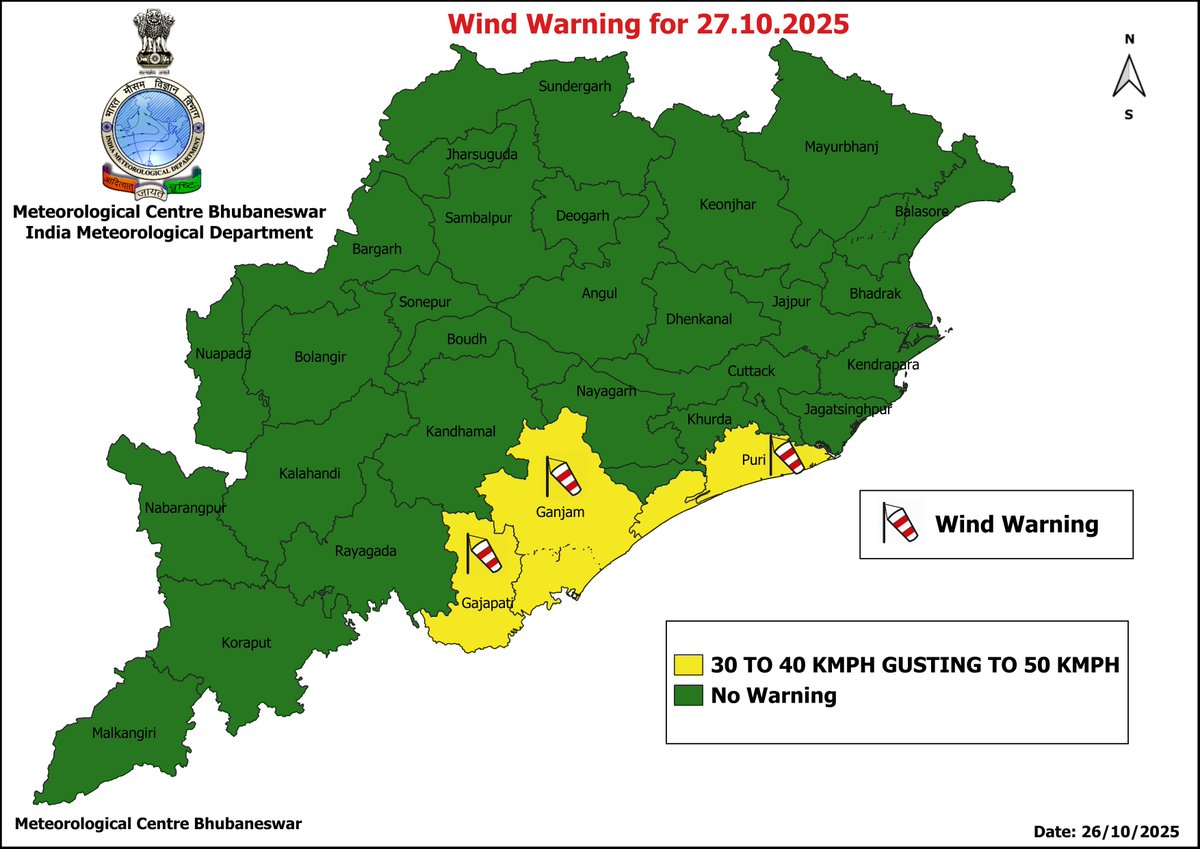 Gusty Surface Wind Warning over Odisha from 27/10/2025 to 29/10/2025. #strongwinds #warning #windwarning