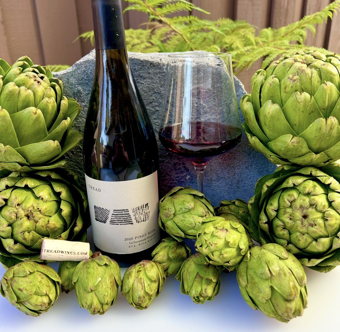 #WineWednesday with a pile of Heirloom artichokes from @PezziniFarms with this Tread Pinot noir from the Santa Rita Hills section of Santa Barbara County. This one has a nose of black raspberry, thyme and lavender with flavors of Santa Rosa plum, nutmeg and cinnamon. Cheers.