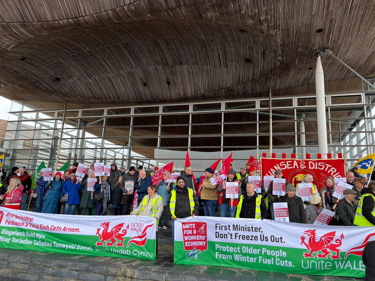 Today, @UniteWales pensioner members & activists turned out at the Senedd to show their anger at the cut to the #WinterFuelAllowance and urged the @WelshGovernment to reinstate the payment like other devolved nations. Pensioners are suffering massively from this brutal cut. ⤵️