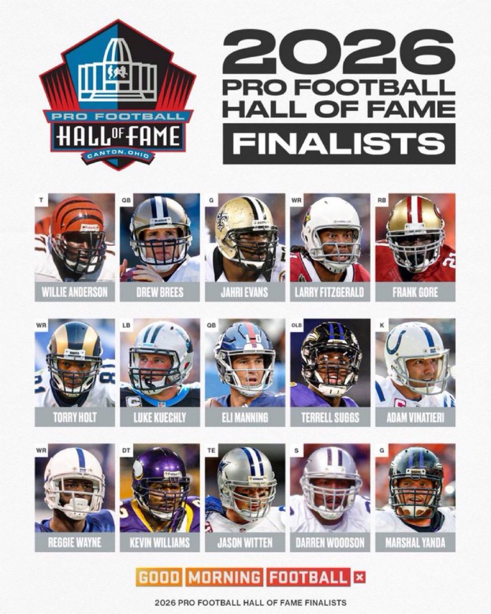 Drew Brees, Eli Manning and Larry Fitzgerald are among the 15 finalists revealed for the Pro Football Hall of Fame 2026 class 🏈