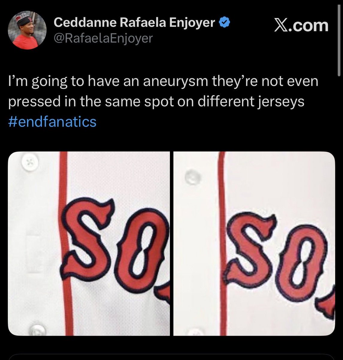 I cannot get over how the Boston Red Sox put out a tweet blaming fanatics incompetence for botching the stitching of their jersey, moments later deleted the tweet and put out a new one completely glazing and defending them. Just a hysterical PR nightmare for fanatics #EndFanatics