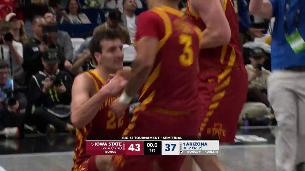 ¡¡MOMCILOVIC!! Triple, recuperación y triple. Iowa State acaba la primera parte con 6 puntos seguidos del alero que la clava sobre la bocina. 43-37 al descanso ante la favorita Arizona. x.com/TheFieldOf68/s…