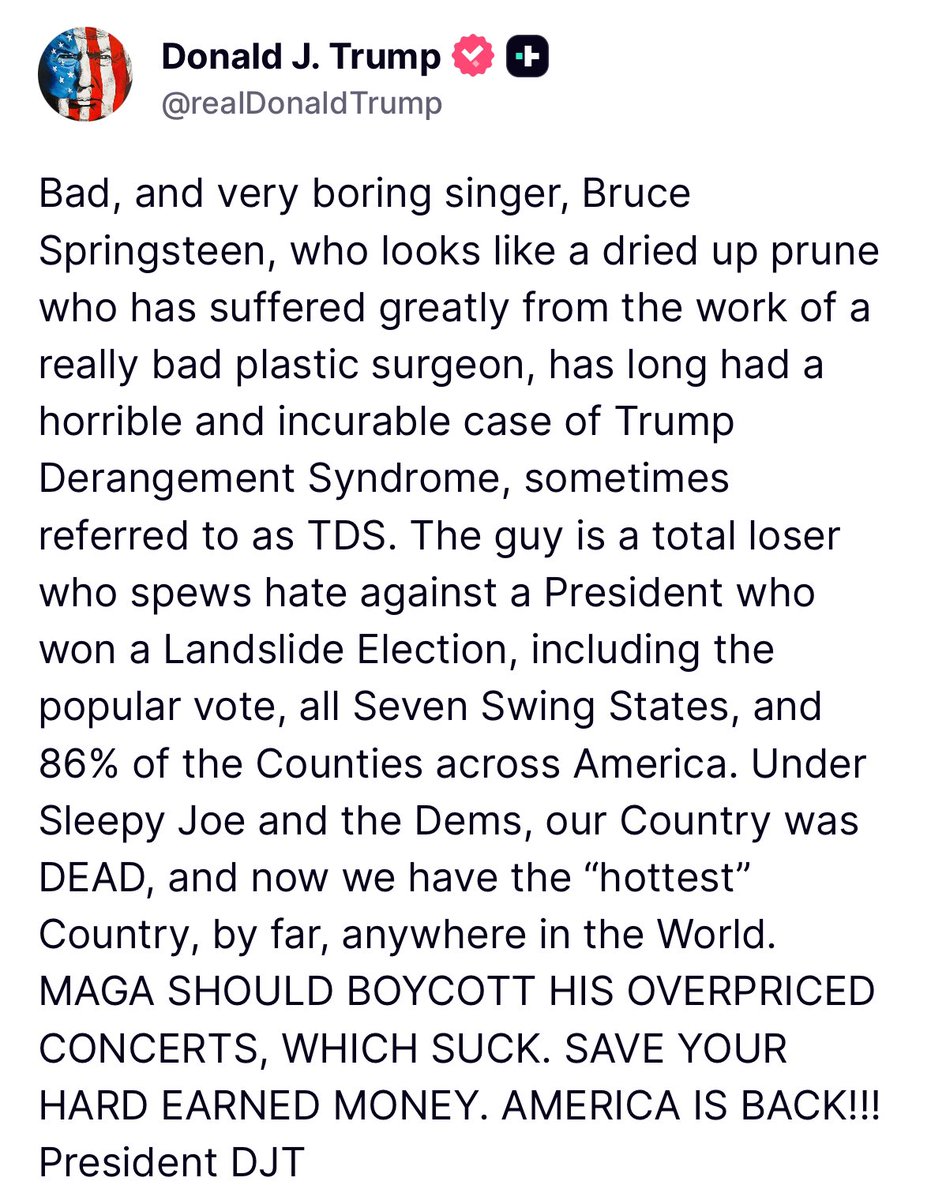 🚨 JUST IN: President Trump PUMMELS Bruce Springsteen as a "dried up prune who has suffered greatly from the work of a really bad plastic surgeon" and says MAGA should BOYCOTT his concerts 🤣🤣 "MAGA SHOULD BOYCOTT HIS OVERPRICED CONCERTS, WHICH SUCK. SAVE YOUR HARD EARNED